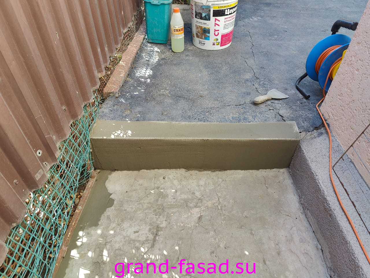 Эркер и цокольную часть дома заармировали, загрунтовали, наносим