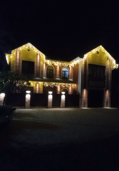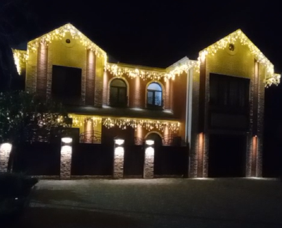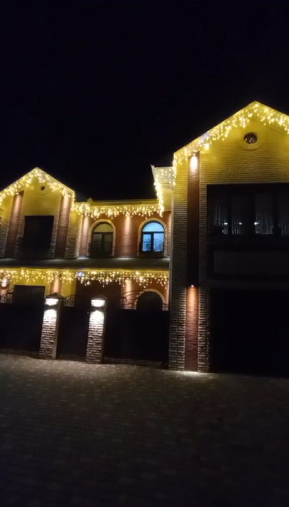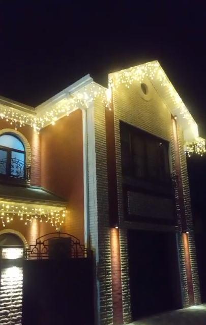 Мы продолжаем делиться с вами нашими выполненными работами. Сам по себе современный, стильный и светлый дом стал просто невероятным с бахромой тёплого свечения свечения. Здесь шикарно подчеркнуты все достоинства дома. Не так ли?
