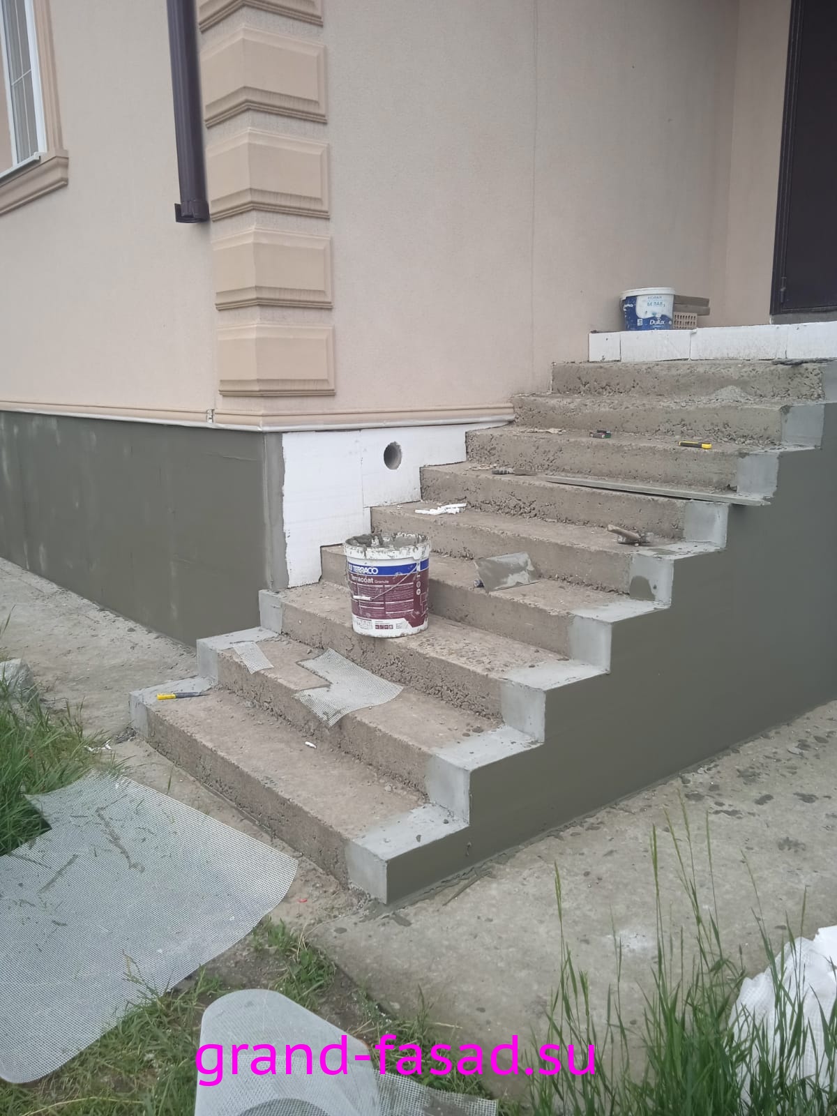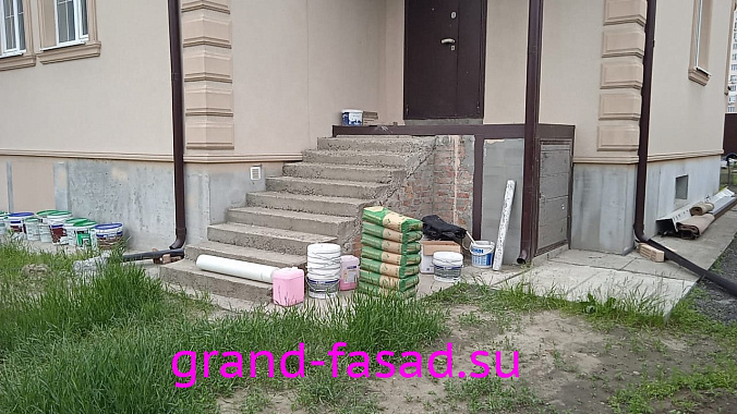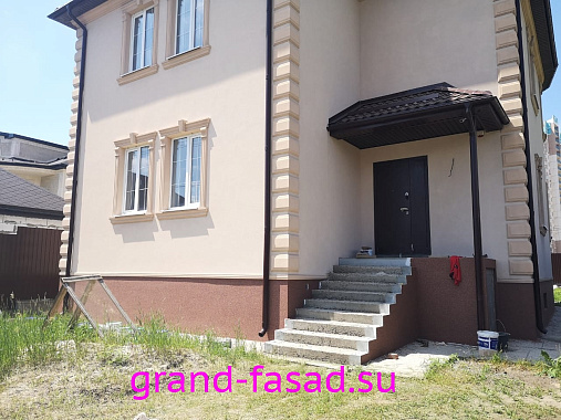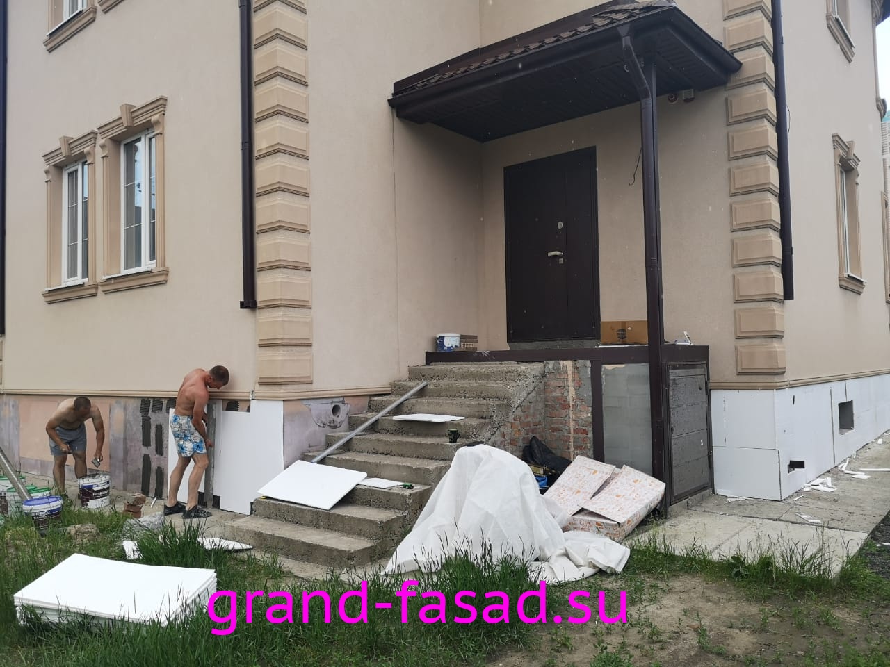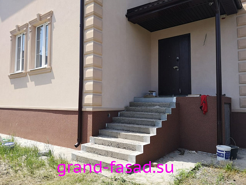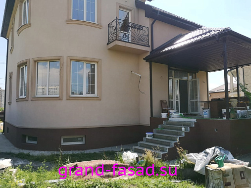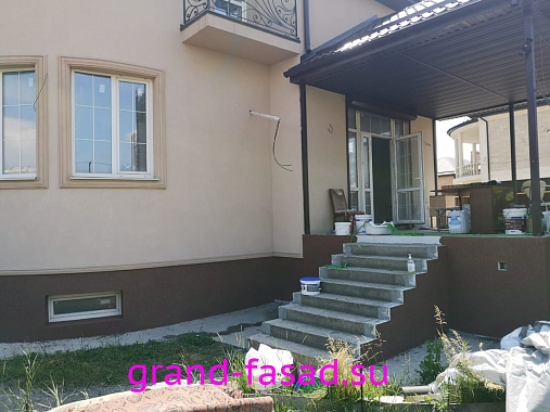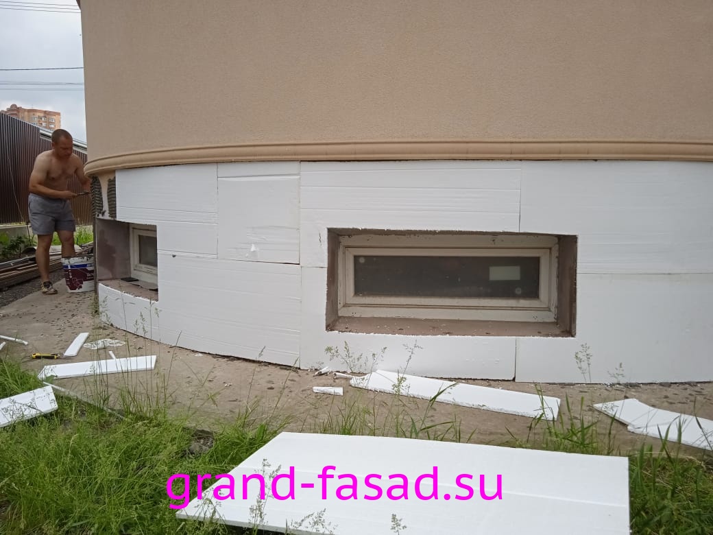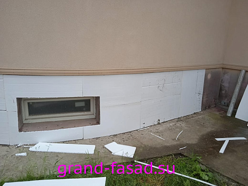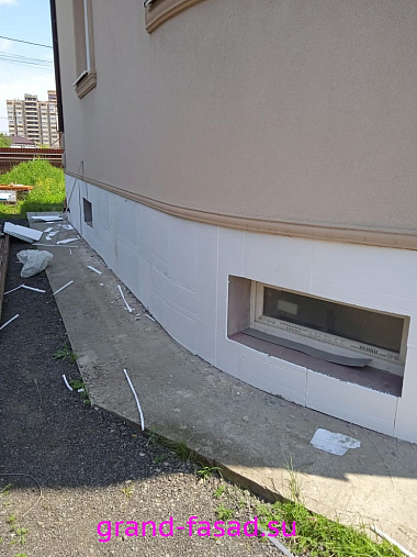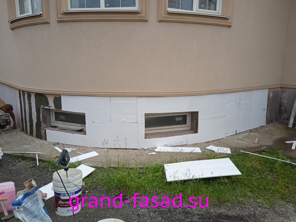 Для утепления цоколя этого дома мы применяли фасадный. В качестве финишного слоя - нанесли декоративную мозаичную штукатурку ТЕРРАЛИТ.