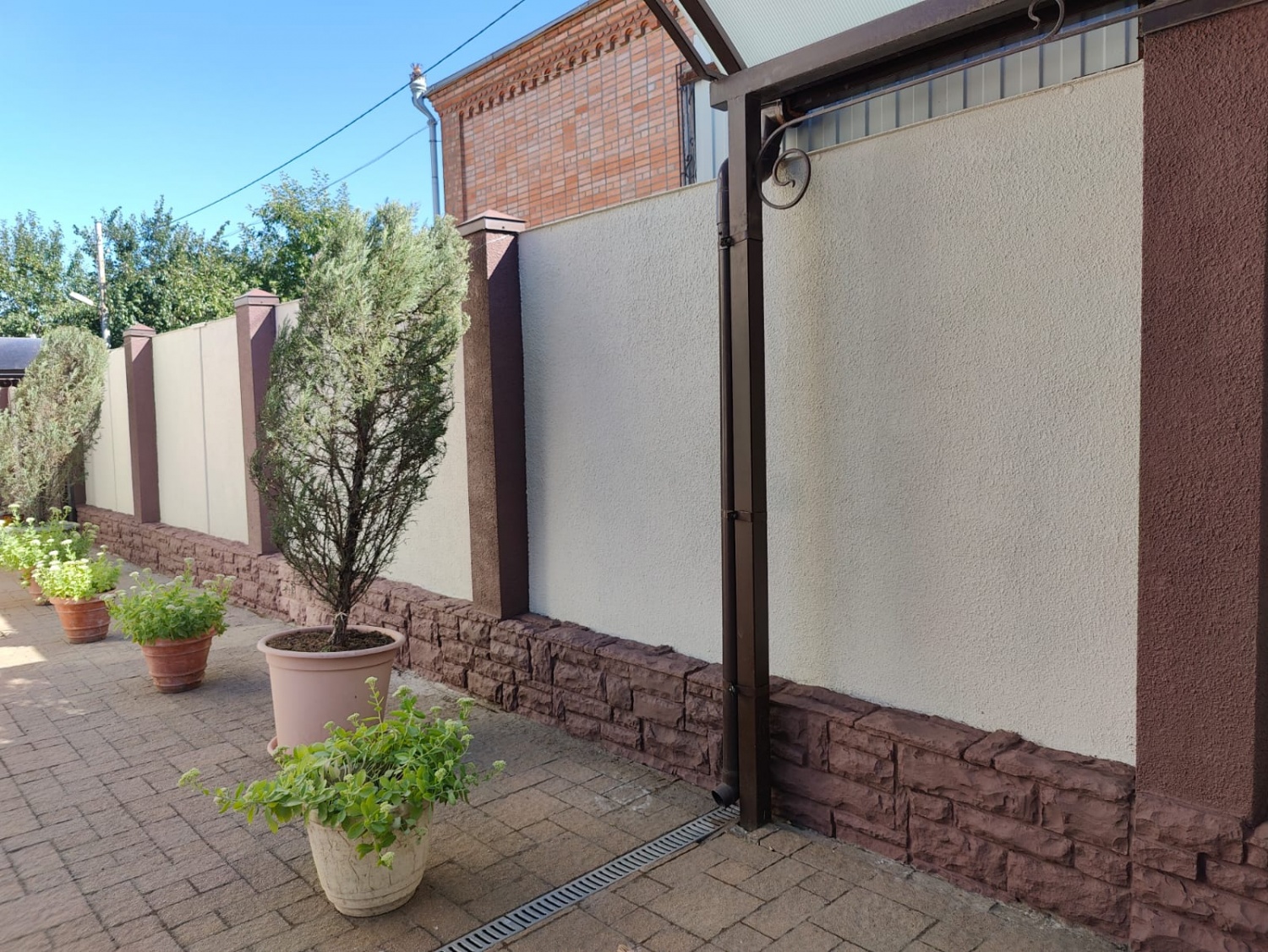 Технология покраски цоколя забора, ничем, по сути, не отличается от покраски цоколя дома. Перед окраской – поверхность цоколя очищают от плесени, грибка и загрязнений. Что мы и сделали. Цоколь, отделанный декоративной плиткой, очисти, помыли, а затем нанесли гидрофобное покрытие. Пропитка защищает основание от попадания влаги, подчёркивает все достоинства декоративного камня. Но, не в нашем случае.