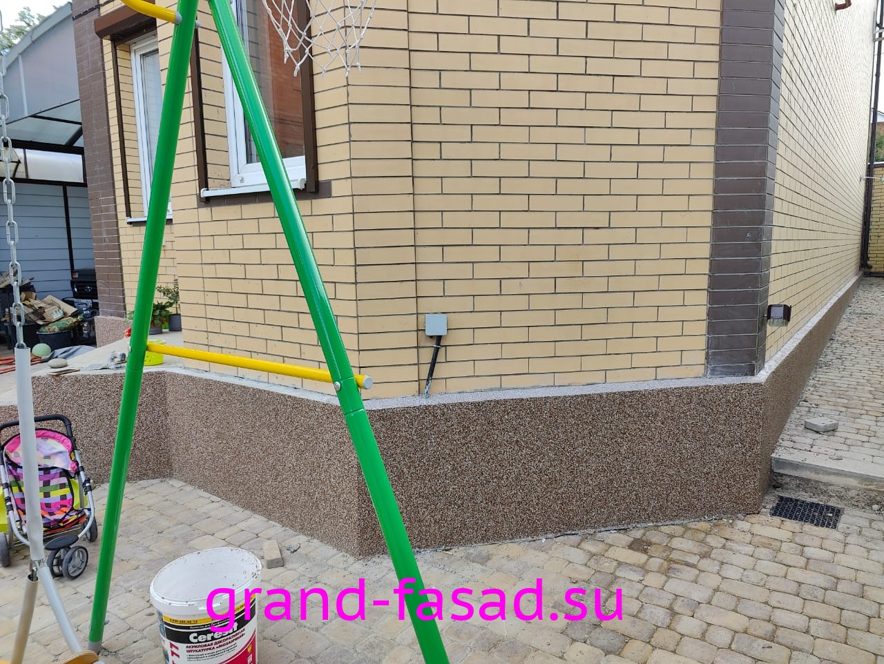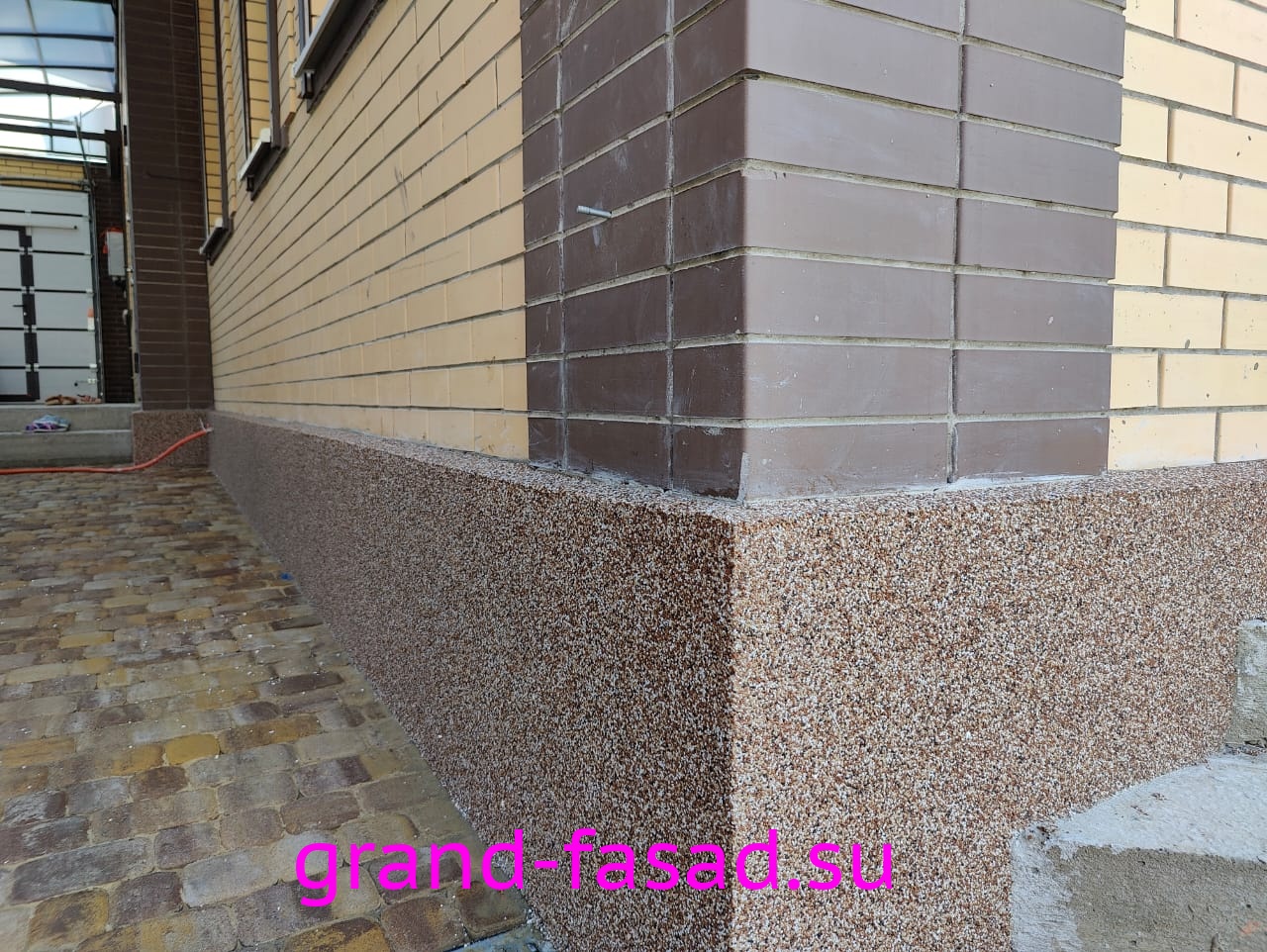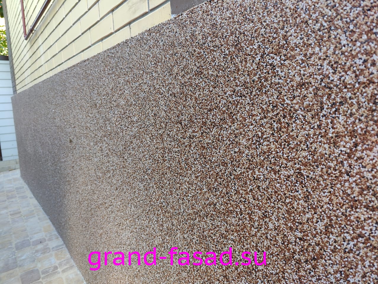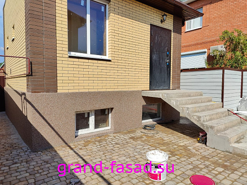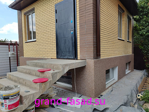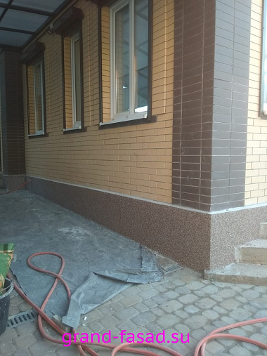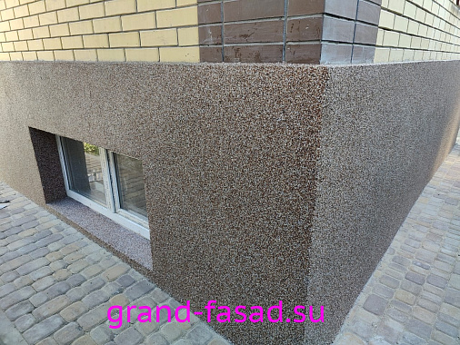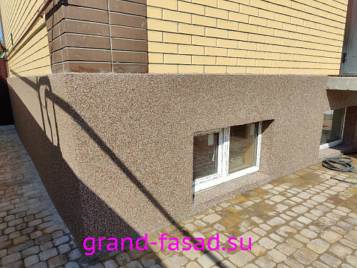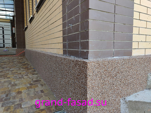 Защита цоколя не прихоть владельцев, а острая необходимость. Мраморная крошка– отличный способ преобразить цоколь дома и выделить его среди серой монотонности. Да и эстетическую составляющую так же следует учитывать.